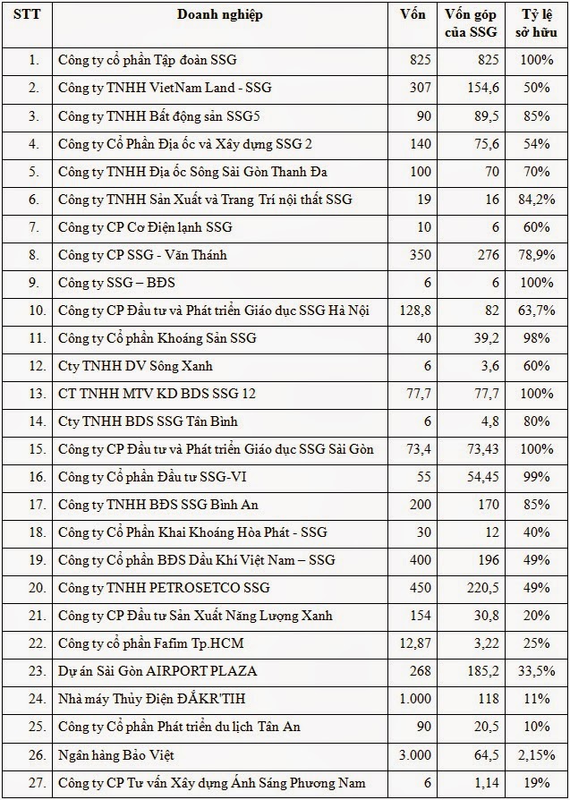 - Một số khoản đầu tư “khủng” khác: Hợp đồng ký với Cty TNHH 1TV PT KD Nhà: 173,6 tỷ; Công ty địa ốc Tân Bình: 62,42 tỷ; Dự án số 5 Lê Quý Đôn: 300,6 tỷ;… Chỉ mới thống kê sơ sơ tính trên vốn điều lệ các công ty và dự án (chưa tính tài sản riêng, tài sản người khác đứng tên giúp, tài sản đứng giúp người khác…) SSG của bà Nguyễn Hồng Phương đang sở hữu khối vốn công khai trên 3.400 tỷ đồng.