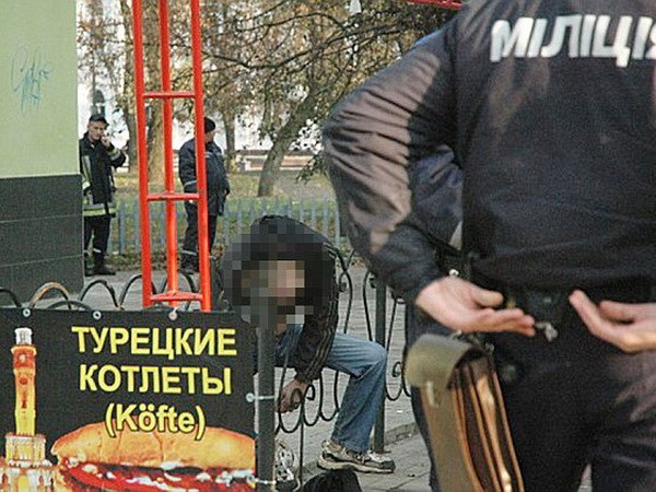 Một người đàn ông đã tự rúc đầu mình vào hàng rào bằng kim loại và vặn mình cho tới khi gãy cổ bên ngoài một cửa hàng đồ ăn nhanh đông đúc ở Ukraine.