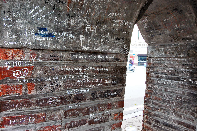 Phá hoại các di tích bằng cách bôi, vẽ bậy cũng khiến cho du khách thiếu thiện cảm khi đến Việt Nam. Trong ảnh là tháp Hòa Phong bên ven bờ hồ Hoàn Kiếm bị người dân thủ đô viết vẽ bậy lên khắp ngôi tháp cổ đã hơn 150 tuổi này.