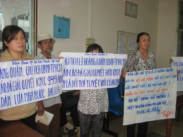 Sáng hôm qua 6/11/2014, nhiều dân oan Sài Gòn, đã kéo về trụ sở tiếp công dân của thành phố ở phố Nguyễn Gia Thiều yêu cầu ông Lê Hoàng Quân, chủ tịch thành phố giải quyết dứt điểm các vụ khiếu kiện về đất đai, tài sản, tố cáo tham nhũng bị trù đập kéo dài nhiều năm. Trong số dân oan có những người lúc đi khiếu kiện tóc vẫn còn xanh, nay đã phơ phơ đầu bạc, bước sang tuổi 'xưa nay hiếm'.