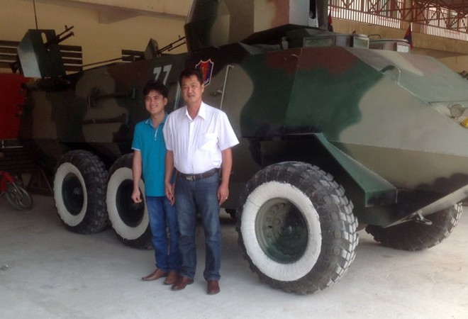 Hai cha con ông Trần Quốc Hải (nông dân chế tạo máy bay ở Tân Châu, Tây Ninh) bên chiếc xe bọc thép mới chế tạo.