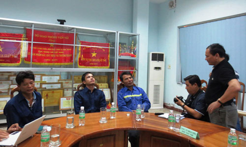 Cục trưởng Cục Hàng hải Nguyễn Nhật (người đứng áo đen) động viên 3 thủy thủ.