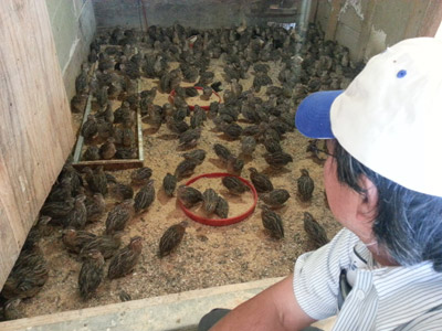 Ông Chín Đàm bên chuồng nuôi cút nhỏ tại nông trại Ramona ở San Diego. (H́nh: Ngọc Lan/Người Việt)