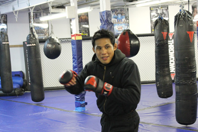 Võ sĩ Nam Phan chăm chú luyện nắm đấm để chuẩn bị đấu với võ sĩ Mike Richman. (Hình: Tâm Nguyễn/Người Việt)
