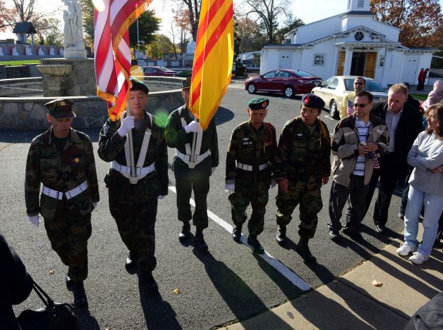 BRIDGEPORT - Vào ngày thứ Bảy, Qua Li và Thin Phạm tự hào được đứng trong toàn quân đội ngụy trang đồng phục, một phần của một người bảo vệ màu giữ lá cờ Mỹ và Nam Việt Nam trong tháng mười một sắc nét gió bên ngoài St. Margaret tỏa sáng.