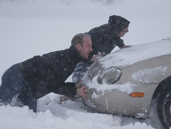 Lực lượng Vệ binh Quốc gia đẩy xe mắc kẹt trong tuyết trên một tuyến đường thuộc bang New York, Daily Mail đưa tin. Cơn bão tuyết từ đầu tuần đang làm tê liệt 50 tiểu bang trên toàn nước Mỹ, bao gồm cả quần đảo Hawaii. Tại nhiều nơi ở bang New York, tuyết đã dày đến hơn 1,8 m. Ảnh: AP