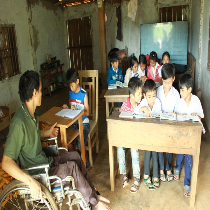 Nhưng dẫu có khó khăn nhường nào, chị Liên luôn đảm bảo cho lớp học của chồng được duy trì, bởi chị biết lớp học này chính là sợi dây níu kéo sức sống cho anh Giới. Ban đầu, lớp học tại gia của thầy Giới chỉ có vài học sinh là con cháu trong nhà, dần dần phụ huynh trong xóm có con học cấp một cũng xin gửi qua thầy ôn tập. Lớp học ngày càng đông, mùa hè có khi lên đến gần hai chục em. Thấy nhà thầy Giới chật chội, một người anh họ đã cho mượn căn nhà nhỏ làm lớp, phụ huynh thì tận dụng gỗ đóng bàn ghế. Sau khi xin phép chính quyền địa phương, thầy Giới chính thức mở lớp dạy thêm miễn phí cho học sinh trong xóm.