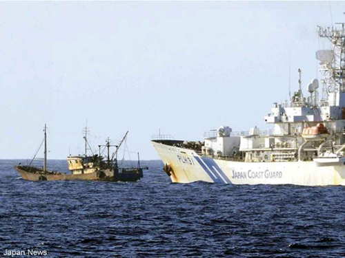 Tàu tuần tra Nhật Bản (phải) ngăn chặn tàu cá Trung Quốc ở ngoài khơi đảo Yomejima Ảnh : Japan News