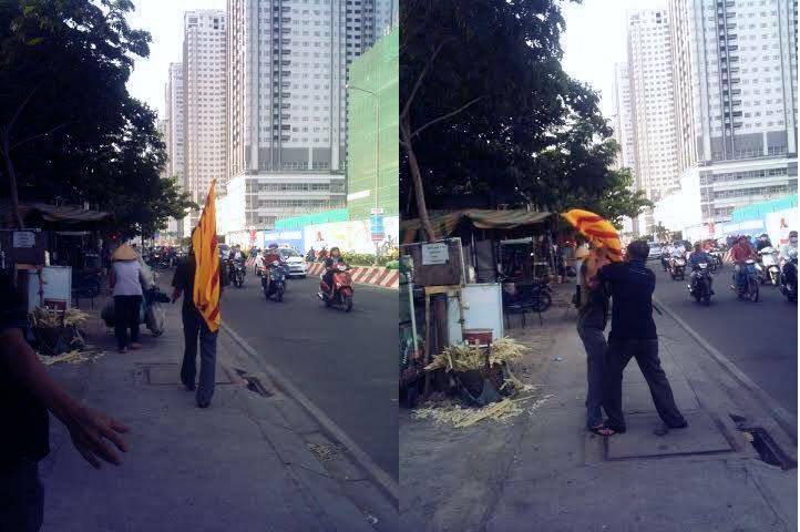 Người âm thầm mang cờ vàng trên vai giữa phố xá Sài G̣n.