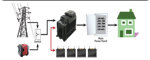 Sơ đồ hệ thống cấp điện thông qua hệ thống dự trữ điện năng UPS và một máy phát và dự phòng – bộ UPS trên có 4 bình accu.