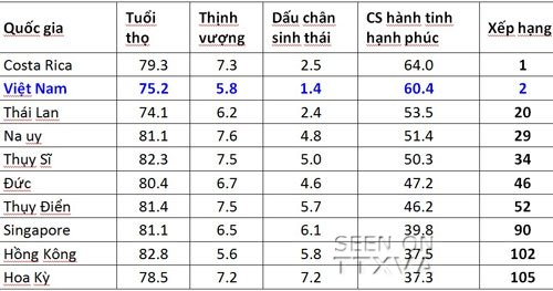 Dưới đây là kết quả xếp hạng chỉ số hành tinh hạnh phúc năm 2012 của Việt Nam và một số nước khác (nguồn Wiki).