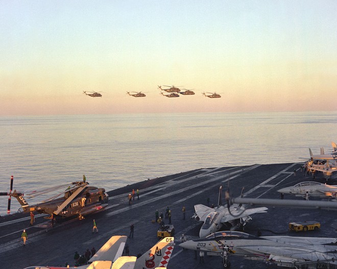 6 trong tổng số 8 chiếc CH-53D của Mỹ thực hiện nhiệm vụ giải cứu con tin ở Iran. Ảnh: Hải quân Mỹ