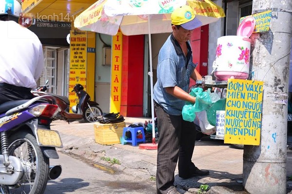 Chỉ tay vào góc đường, nơi có bình nước miễn phí, anh Hùng cho biết, hằng ngày có rất nhiều người nghèo khổ đi qua đây uống nước. Mỗi ly nước chỉ vỏn vẹn 2.000 đồng nhưng với những người lao động nghèo khổ đó lại là số tiền không hề nhỏ bởi họ phải cố chắt chiu từng đồng bạc lẻ để lo cho gia đình.