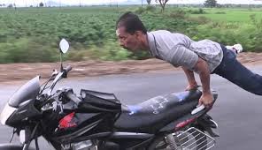 Bạn có thể gọi người đàn ông 40 tuổi đến từ Ấn Độ trong clip là một nghệ sĩ. Anh đã có những pha mạo hiểm với tính mạng trên chiếc xe máy chạy tốc độ 60km/h kèm theo những động tác như một bài tập Yoga.