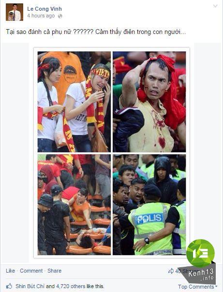 Thế cho nên, chưa kịp hân hoan ăn mừng chiến thắng, nhiều cầu thủ tuyển Việt Nam đã tỏ ra cực kỳ bức xúc. Trên trang Facebook chính thức của Công Vinh, chàng tiền đạo xứ Nghệ đã chia sẻ những hình ảnh CĐV Việt Nam bị đánh, trong đó có cả những phụ nữ và viết: “Tại sao lại đánh cả phụ nữ? cảm thấy điên trong con người…”.