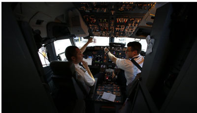 Hai phi công trên một máy bay của Southwest Airlines thực hiện những thao tác chuẩn bị cuối cùng trước chuyến bay thứ nhất trong ngày vào lúc sáng sớm từ phi cảng Love Field, Dallas. (Hình: AP/LM Otero)