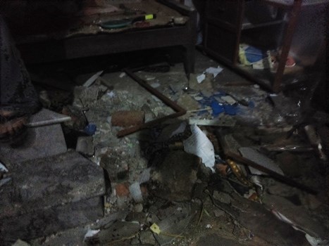 Tại hiện trường ngôi nhà chờ trên tầng 2 nơi anh Thung chế thuốc pháo đổ sập hoàn toàn, gạch đá vung vãi khắp nơi. Mái nhà bếp lợp bằng tờ rô gần đó bị sập gần hết, mùi thuốc nổ nồng nặc.