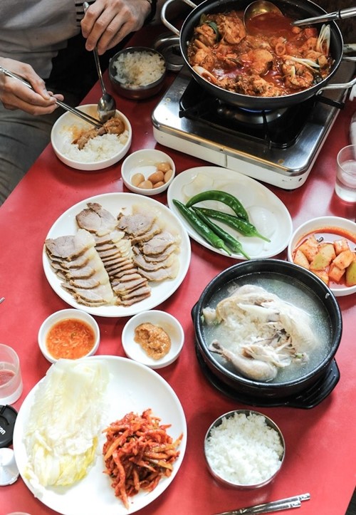 Tương tự như vậy, không ai trong bàn ăn đụng đũa trước khi người lớn tuổi nhất bắt đầu. Việc rời khỏi bàn cũng được quyết định bởi người này: Bạn chỉ kết thúc bữa ăn và đi khỏi khi người lớn tuổi nhất dùng xong bữa. Tuy nhiên, ngày nay tại Hàn Quốc, quy tắc đó đã thoải mái hơn nhiều và thường chỉ được lưu ý hơn vào các dịp lễ lạc.