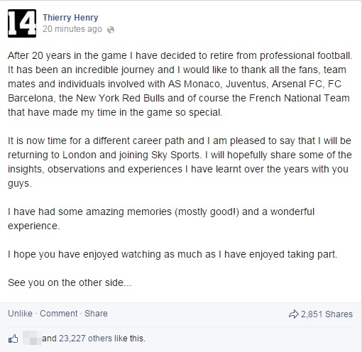 Gần đây, nhiều tin đồn cho hay Thierry Henry chuẩn bị giã từ sự nghiệp khi anh không hề đề cập tới việc gia hạn hợp đồng với New York Red Bulls dù hợp đồng cũ sẽ hết hạn vào ngày cuối năm nay. Và đến hôm nay, những tin đồn đó đã trở thành sự thật khi huyền thoại người Pháp chính thức tuyên bố rời xa sân cỏ.