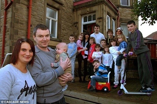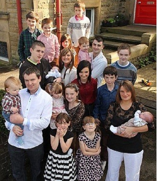 Ông Lancashire 43 tuổi cùng vợ, cô Sue 39 tuổi là cặp vợ chồng thanh mai trúc mã. Do lần đầu tiên mang thai ở tuổi 14 nên không thể phá thai, cứ như vậy, côSue sinh liền tù tì 17 đứa trẻ. Gần như là mỗi năm vợ chồng cô đều có thêm một em bé, thậm chí họ đã có 2 đứa cháu rồi. Tháng 7 năm nay, cô Sue không may bị sảy thai, hai người đã đau khổ rất nhiều.