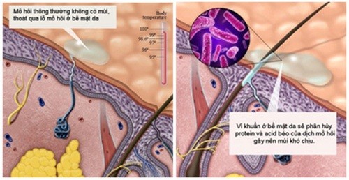 Vi khuẩn ở bề mặt da sẽ phân hủy protein và acid béo của dịch mồ hôi gây nên mùi khó chịu..
