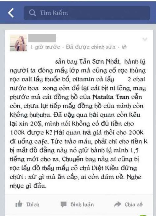 Theo đó, cô đã bị lấy mất thuốc bổ, vitamin và hai chai nước hoa.. trong vali. Thêm vào đó, khi qua cửa hải quan còn bị "vòi tiền" cafe 200.000 đồng.