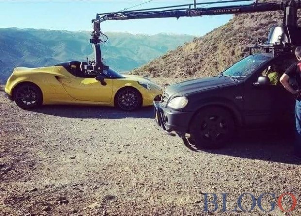 Alfa Romeo 4C Spider màu vàng và đỏ với bộ la-zăng hợp kim đen đối lập bị các tay săn ảnh bắt gặp khi đang tham gia quá trình quay phim quảng cáo.