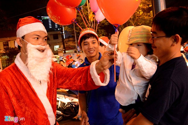 Trẻ em bất ngờ được nhiều thanh niên mặc đồ ông già Noel tìm tới tặng quà, cho kẹo. Ảnh: Minh Thanh.