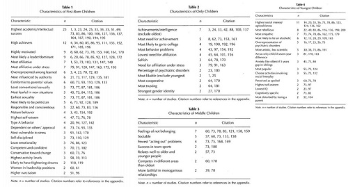 Cụ thể, những đứa trẻ đầu lòngh có xu hướng đạt được những đạt được những kết quả và thành công cao hơn. Những người là con một trong già đình luôn khao khát đạt được thành tựu. Những đứa con giữa thường dễ gần gũi. Và cuối cùng là những đứa con út, thường hướng tới các giao tiếp trong cuộc sống xã hội. Bên dưới đây là bảng thống kê 200 nghiên cứu trong cơ sở dữ liệu của nhóm.
