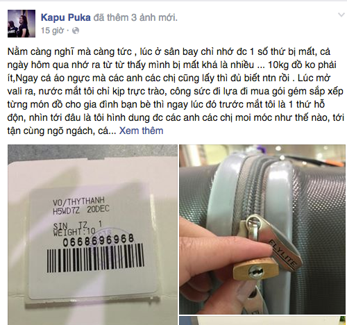 Chị bị thất lạc hành lý 4 ngày, mới nhận lại được ngày 25-12-2014. Tuy nhiên sau khi nhận lại Vali thì thấy vali nhẹ đi rất nhiều, đem cân thì hụt gần 10kg.Sau khi mở ra kiểm tra chị phát hiện vali bị xới tung, toàn bộ đồ mới được chị đóng gói đem về làm quà cho bạn bè người thân đã mất, bên trong chỉ còn lại vỏ bọc của số đồ. ( Khoá vali vẫn còn nguyên)
