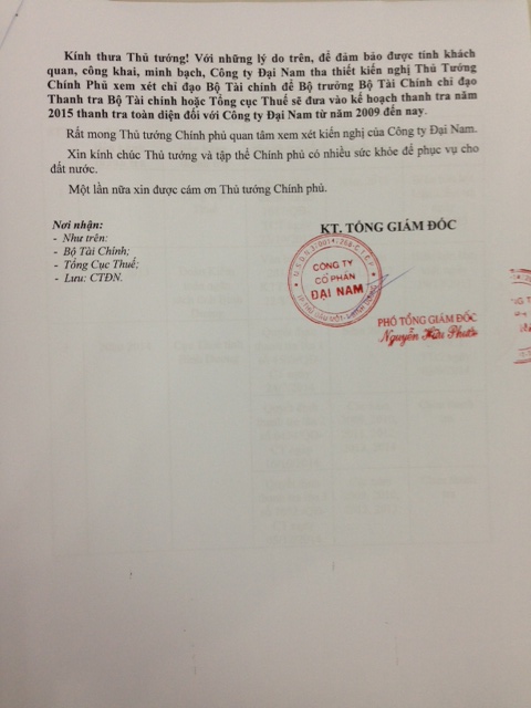 Từ những lý do trên, để đảm bảo được tính khách quan, minh bạch; ông Huỳnh Uy Dũng và tập thể cán bộ - CNVC Cty CP Đại Nam kiến nghị Thủ tướng Chính phủ xem xét chỉ đạo Bộ Tài chính, để Bộ trưởng Bộ Tài chính chỉ đạo Thanh tra Bộ Tài chính hoặc Tổng cục thuế sẽ đưa vào kế hoạch thanh tra năm 2015, thanh tra toàn diện đối với Cty CP Đại Nam, từ năm 2009 đến nay.