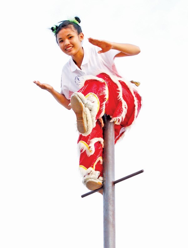 Tiếng trống dồn dập một hồi chưa dứt, Lê Yến Quyên nhỏ nhắn, hai tay nâng đầu lân từ dưới đất thoăn thoắt leo lên đỉnh cột sắt cao 7 m, đường kính 76 cm. Trên đỉnh cột cao chót vót, Quyên đặt chân lên thanh sắt nhỏ xuyên ngang qua cột rồi múa các bài lân chào, uốn lượn, phun tuyết, xoay tròn. Thế rồi, đột ngột, từ đỉnh cột, Quyên chúi đầu, ngửa người vụt xuống đất. Người xem ù, òa thót tim. Chưa kịp định thần đã thấy cô tươi cười nơi chân cột.