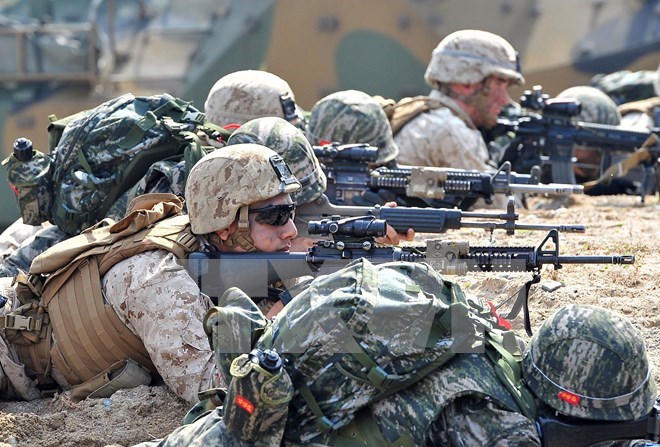 Lính thủy đánh bộ Mỹ và Hàn Quốc diễn tập đổ bộ trên bãi biển trong cuộc tập trận chung Mỹ- Hàn Quốc vào tháng 3/2014. (Nguồn: AFP/TTXVN)