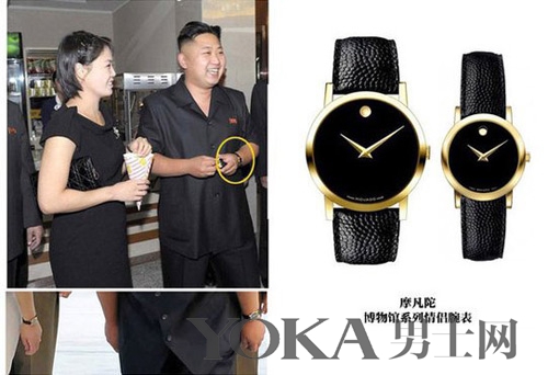 Lãnh đạo Triều Tiên Kim Jong-un không dưới 1 lần "bị" chụp ảnh đeo chiếc đồng hồ thạch anh Movado Museum, có giá khoảng 24 triệu VNĐ. Đệ nhất phu nhân Triều Tiên Ri Sol-ju được cho là cũng sở hữu một chiếc đồng hồ "tình nhân", cùng cặp với chiếc của chồng.