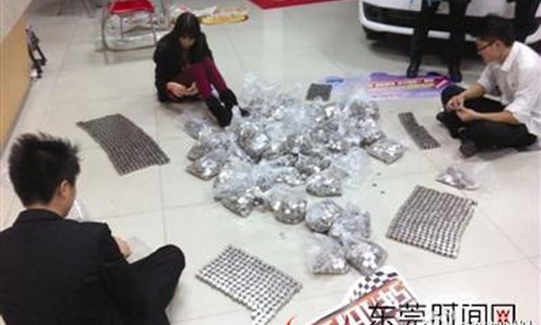 Vị khách hàng ở Đông Quan, tỉnh Quảng Đông, Trung Quốc đã mang tới đại lý ôtô 85 túi to chứa 85.000 đồng xu loại 1 NDT để mua một chiếc xe tải.