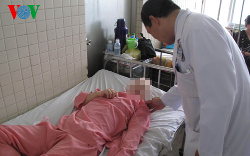 Chị Trần Thị Bích T., 25 tuổi, quê ở Tiền Giang được đưa vào Bệnh viện Chợ Rẫy vào 2 giờ hôm nay trong tình trạng bị hôn mê và liệt một phần hai người bên trái. Người nhà nói chị T. bị chồng dùng bình bông đánh vào đầu vào tối hôm qua (12/1) và được đưa đi cấp cứu tại Bệnh viện tỉnh Tiền Giang, nhưng do tình trạng quá nặng nên được chuyển ngay đến Bệnh viện Chợ Rẫy.