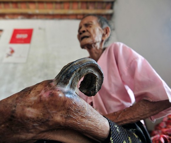 Ban đầu, chiếc sừng giống như một mảnh da thô dày. Con cháu từng dùng lưỡi dao lam cắt cho cụ. Thế nhưng từ tháng 7/2012 nó đã phát triển rất nhanh, cắt cũng không được vì cụ kêu đau và phải nằm co chân.