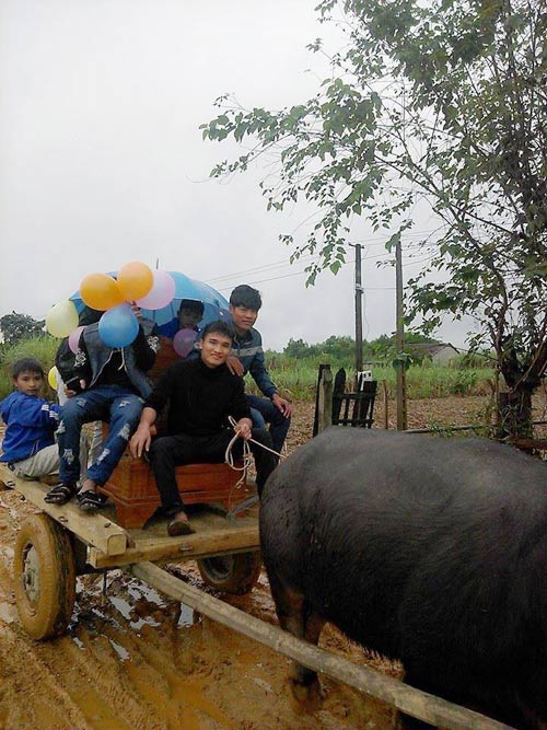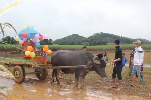 Em gái chú rể, chị Phương Thảo cho biết: “Anh trai Trần Văn Thành (1990) trú tại xã Thọ Sơn lấy chị Trần Thị Tuyết (1992) ở xã Thành Sơn. Anh Thành làm việc ở huyện còn chị Tuyết vừa tốt nghiệp đại học. Hai gia đình cách nhau 10 km nên đám cưới chuẩn bị đầy đủ xe hoa, ô tô cho người nhà. Tuy nhiên, quãng đường này có tới 2km đường lầy lội khiến ô tô không thể đi qua được. Chú rể đã bàn với thanh niên trong làng lấy xe trâu, bỏ ghế lên trang trí vừa vui lại vừa ý nghĩa cho đám cưới thôn quê".