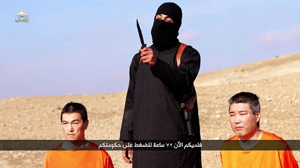 Hình ảnh IS bắt cóc 2 con tin người Nhật. Con tin phía bên trái là ông Kenji Goto Jogo và bên phải là ông Haruna Yukawa.