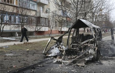 Một chiếc xe cháy rụi sau khi trúng pháo kích ở Mariupol hôm 24-1.