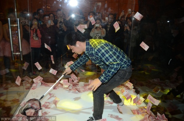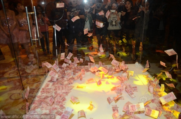 Công ty này dựng một lồng kính trong suốt bên trong rải hàng vạn Tệ tiền mặt, tất cả số tiền này đều do các người mẫu xinh đẹp được công ty mời đến rải.