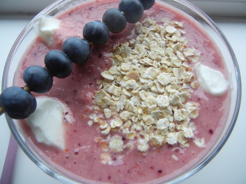 Đặt tất cả các thành phần trong máy xay sinh tố và trộn vài phút. Bạn có thể trang trí nó với muesli hoặc bột yến mạch.