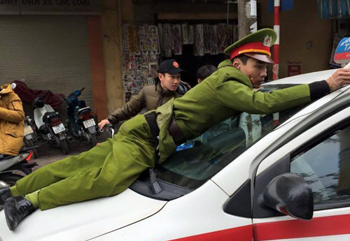 Cảnh sát nằm trên nóc capo xe taxi chạy trên phố Tuệ Tĩnh chiều nay.