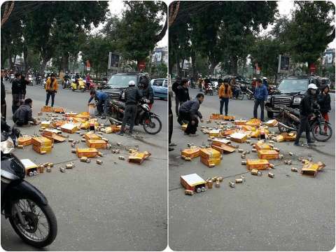 Trước sự hùng hổ của chủ nhân chiếc xe, anh chở bia chỉ im lặng và lủi thủi nhặt từng lon bia lên. Người dân xung quanh chứng kiến sự việc thương tình ra giúp anh ấy 1 tay.