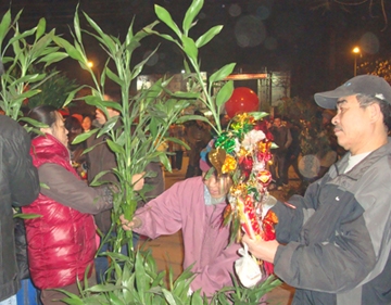 Sung có giá từ 40 đến 50 nghìn đồng, một cặp mía tím có giá 100 nghìn đồng không mặc cả… Những người bán hàng tràn cả xuống lòng đường chào mới tạo ra một không khí náo nhiệt những vô cùng đặc biệt vì mỗi năm cảnh tượng bán lộc chỉ kéo dài ít giờ đồng hồ sau thời khắc giao thừa.