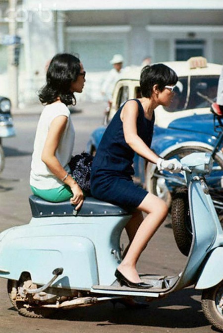 Dáng ngồi bên của phụ nữ Sài Gòn, thể hiện được nét nữ tính, nhu mì. Những năm 60, 70 của thế kỷ trước, xe Vespa ở Sài Gòn khá phổ biến, hình ảnh người đàn ông cầm lái sẽ đẹp hơn khi có một cô gái duyên dáng, trẻ trung mặc áo dài hoặc váy ngồi trên yên sau. Ảnh được tạp chí Life ghi lại năm 1961.