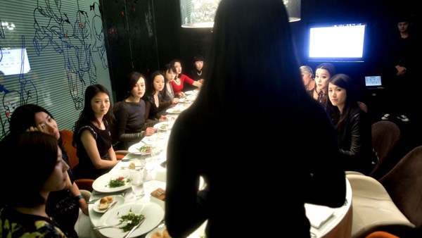 Năm người phụ nữ Trung Quốc ngồi thẳng lưng trên ghế, túi xách tay hàng hiệu để ở dưới chân, tập trung lắng nghe một phóng viên ảnh của tạp chí Tatler của Trung Quốc giảng về cách tạo dáng như thế nào ở nơi công cộng.