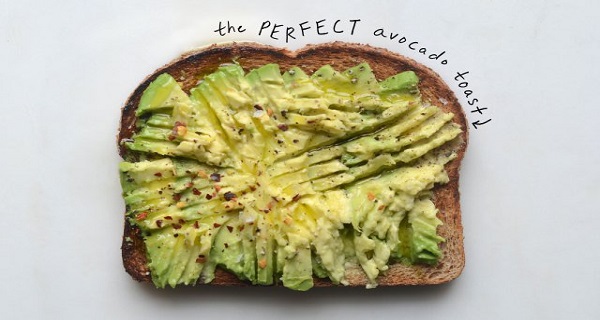 Cắt bơ thành lát và đặt chúng lên những lát bánh mì trong một hình quạt.