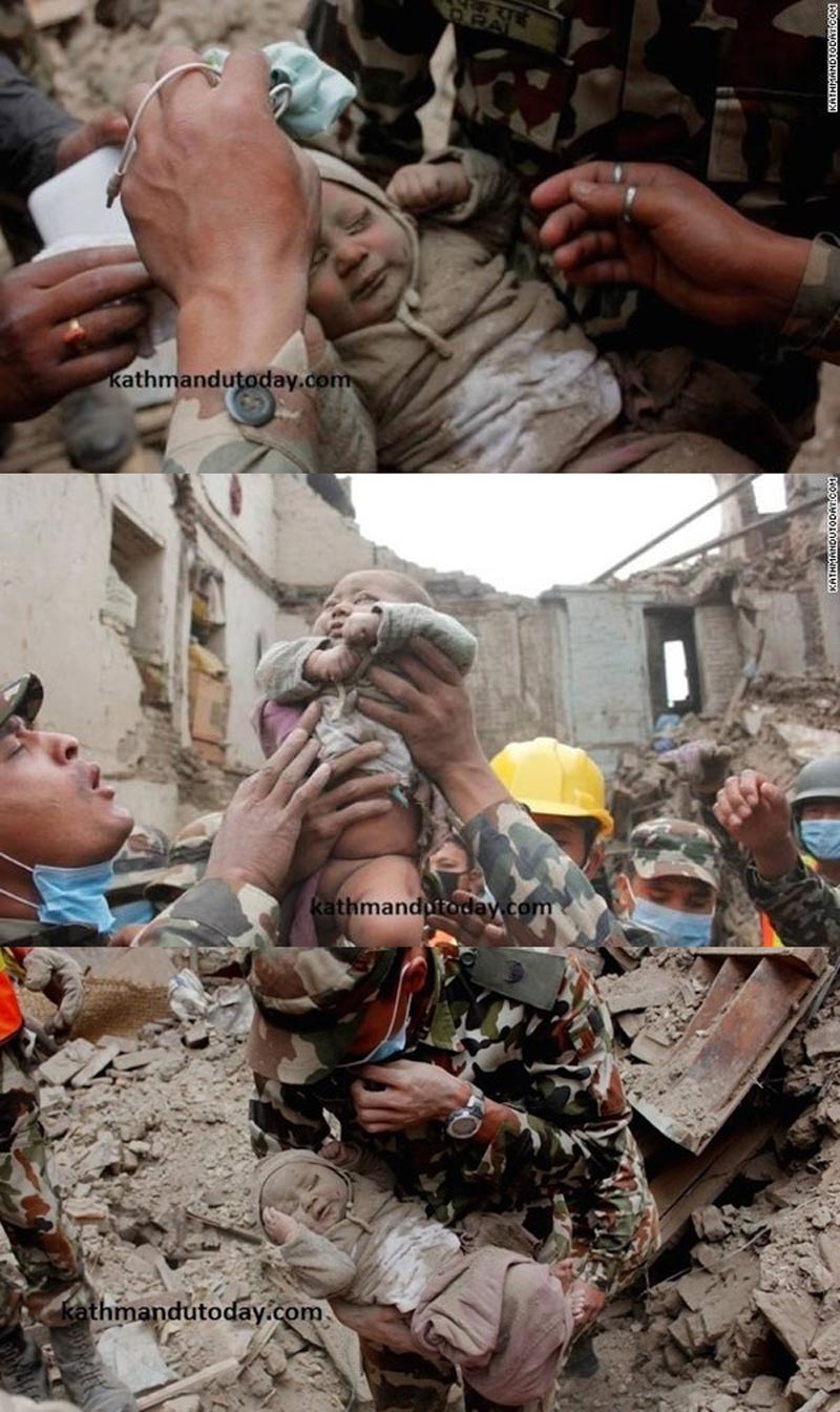 Trận động đất 7,8 độ richter và hàng trăm đợt dư chấn vừa qua tại Nepal đã làm hàng nghìn người chết, hơn 10.000 người bị thương và con số này được dự báo vẫn sẽ còn tiếp tục tăng theo từng ngày. Giữa thảm kịch đó, sự sống sót kỳ diệu của một em bé mới 4 tháng tuổi khiến nhiều người phải nghẹn ngào xúc động.