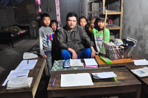 Sau đó tiếp tục viết những bài toán cho các em lớp 3, lớp 4 rèn luyện bài tập về nhà, đồng thời giúp các em chữa các bài tập mà các em chưa hiểu và khó. Cứ như vậy, dù lớp học có nhiều lứa tuổi khác nhau nhưng dưới sự hướng dẫn lô-gic của anh Trường lớp học vẫn rất trật tự và nề nếp